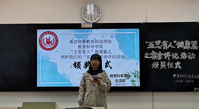 为了进一步加强宿舍文化建设,鼓励同学们营造温馨和谐的寝室环境。公司于1127日下午13:30在博雅楼3405教室举办“五思育人”健康篇之呵护我们的室界宿舍评比活动颁奖仪式。本次颁奖仪式由教科院员工会生活部承办,并邀请张启昕书记、李鹏老师担任颁奖嘉宾。