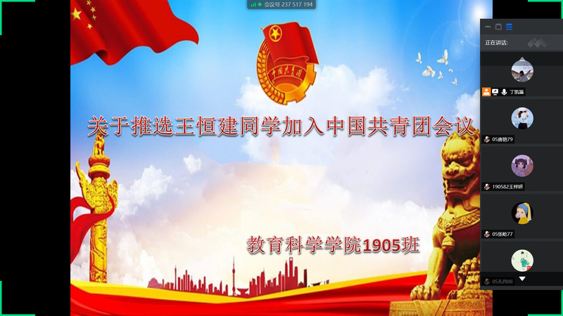beat365亚洲体育官方网站1905班全体同学于2020年5月22日进行了线上会议,会议对推选王恒建同学加入中国共青团进行班级内表决,会议由团支书丁凯瀛主持。