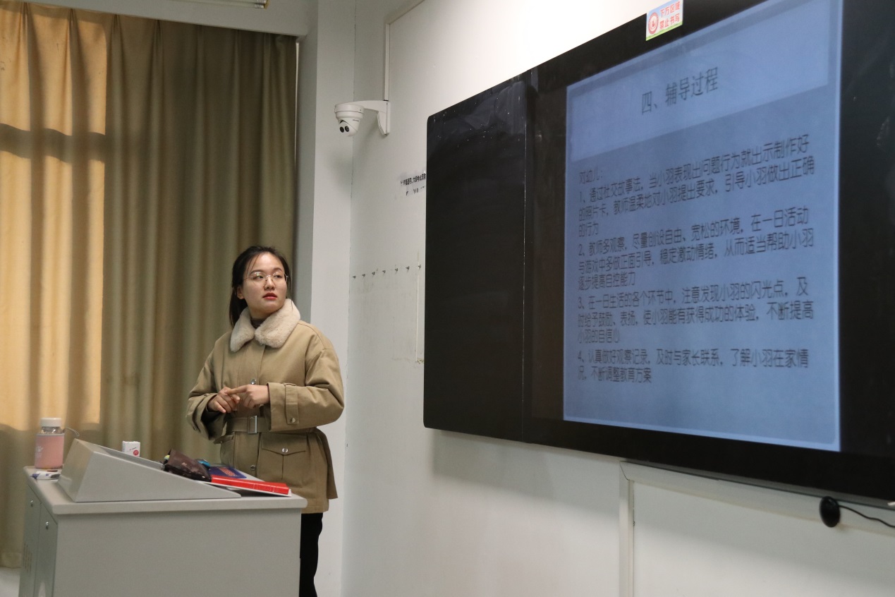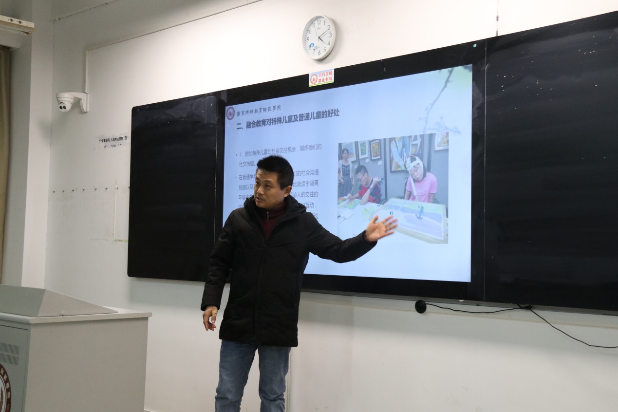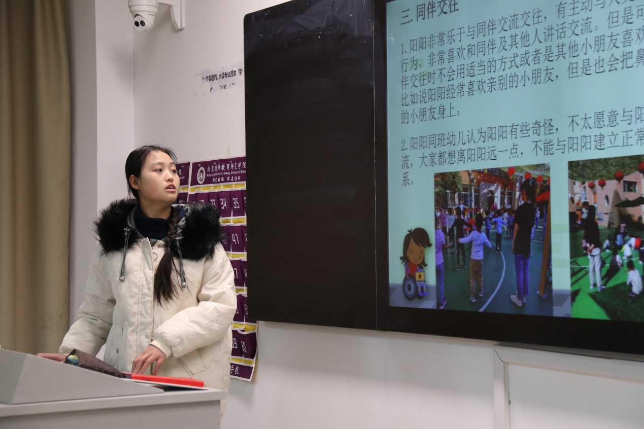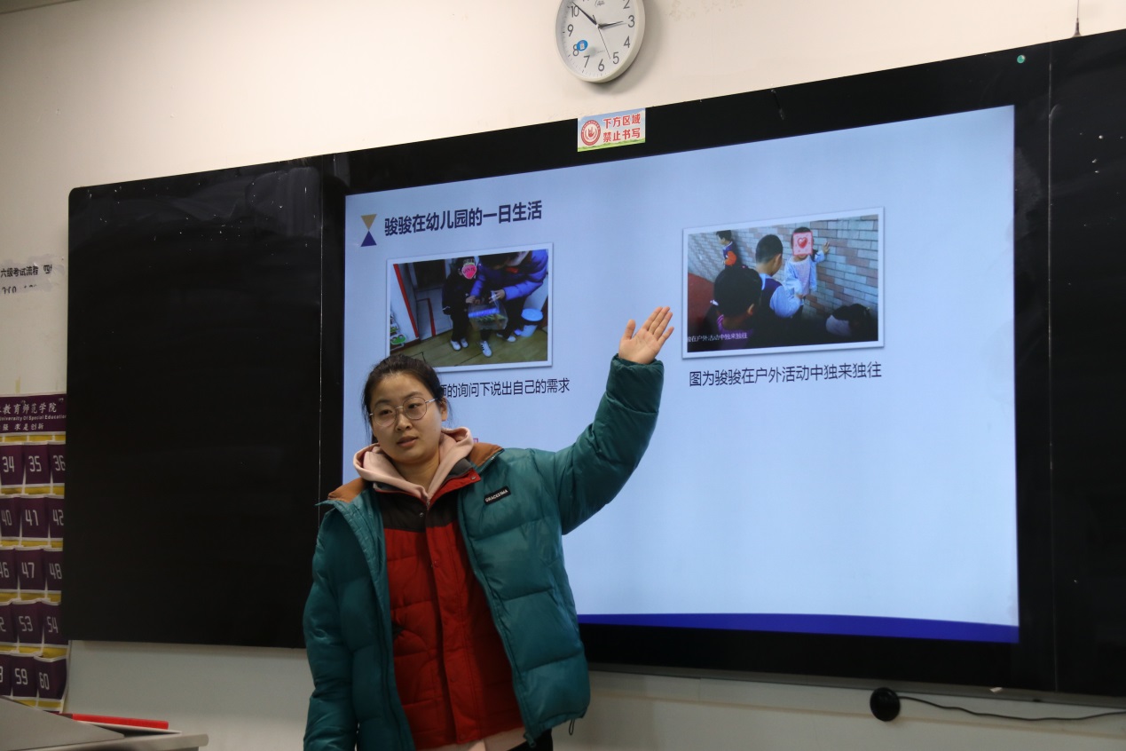 师生互动环节,学前教育专业17级本科实习生和18级见习生团队合作、精心准备PPT,分享了到南京市普通幼儿园、融合幼儿园、康复中心幼儿园和特殊公司与特殊幼儿亲密互动的经历与感受。员工汇报既有认真观察特殊幼儿一日生活的感性描述,也有虚心学习带班教师指导策略的理性思考,更有积极尝试与班上教师合作实施早期干预的有效互动。郭慧琳同学对康复中心的自闭幼儿的个别教育的全过程进行了完整汇报,焦雪昕同学对自闭症幼儿一日生活的过程进行了非常详细地记录和分析,李迪同学将班上教师和资源教师共同为自闭症幼儿干预的过程绘制成图表分享。同学们在走近融合教育实践现场、感受融合教育环境和亲身体验融合教育活动的过程中,树立了为所有幼儿服务、积极投身融合实践的教育情怀,感受了融合校园文化的独特魅力。