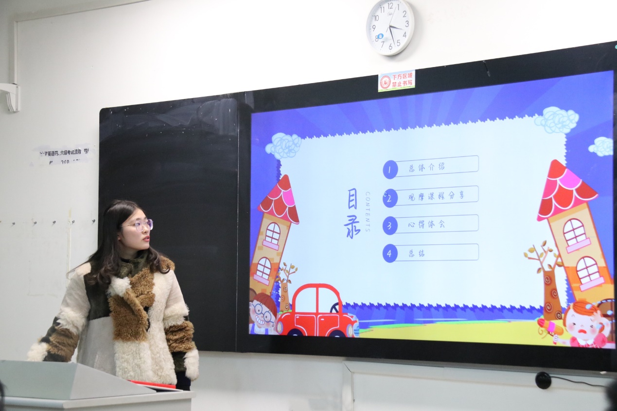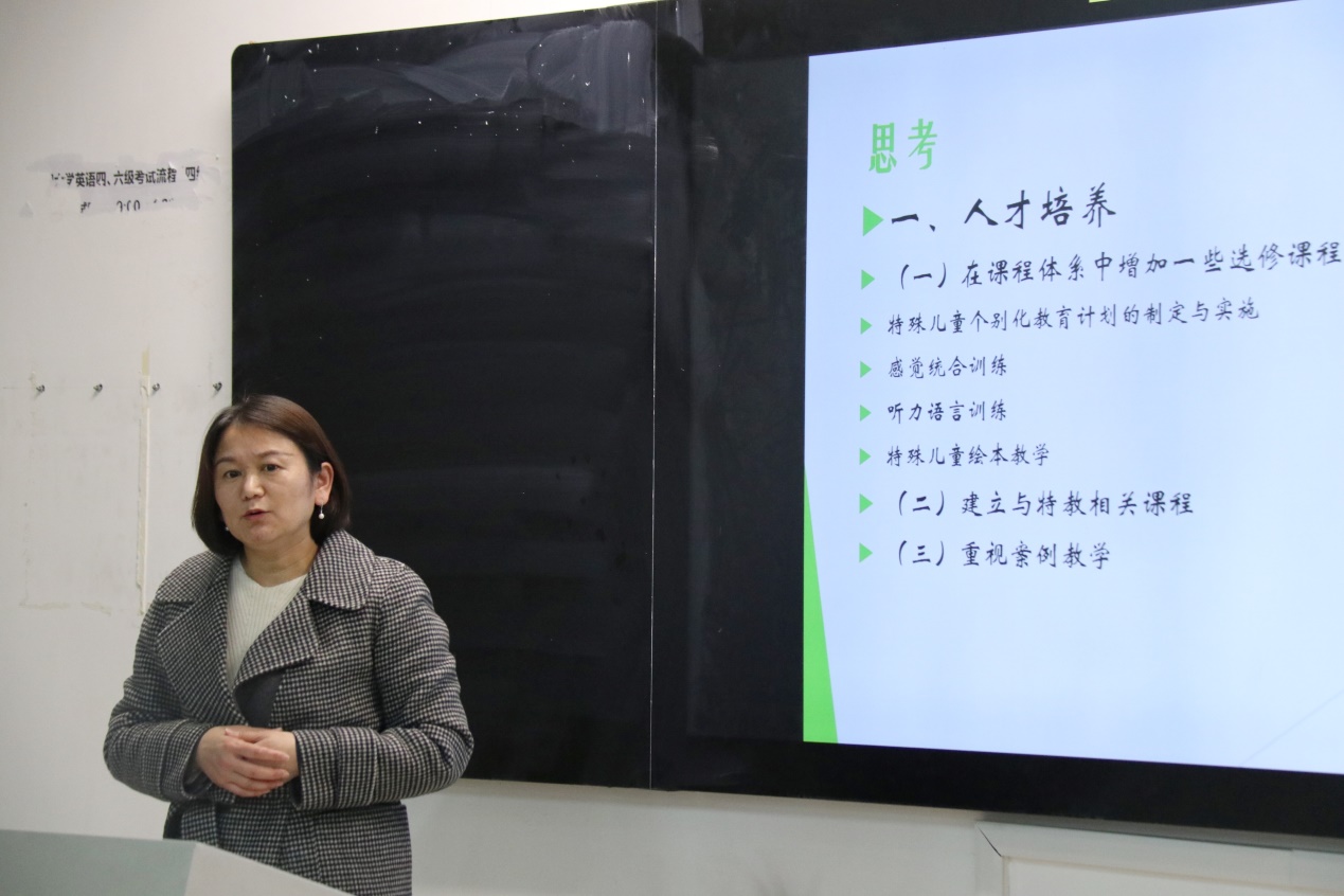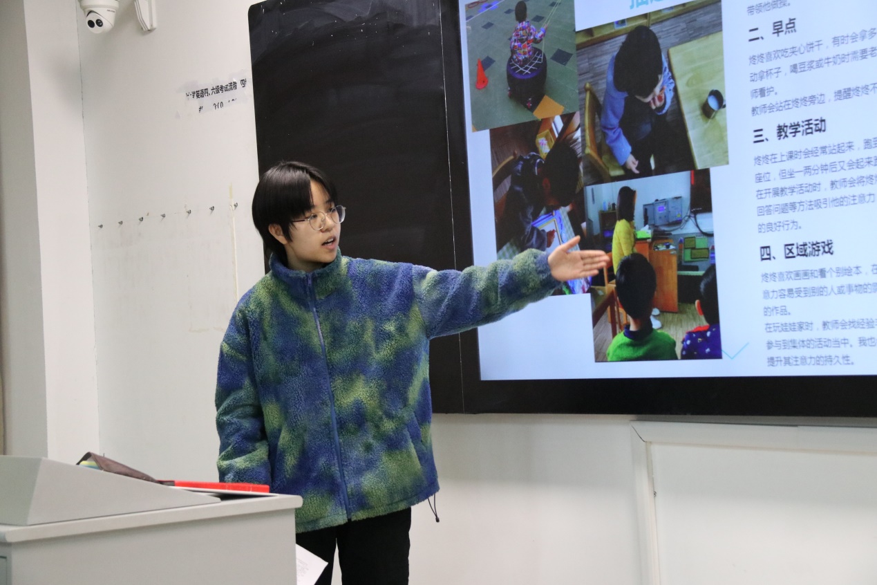 反馈环节,李会敏、韩媛媛、秦奕三位实习指导教师依次进行发言,与员工的融合教育实践展开师生对话。老师们回顾了实习之初与同学们交流学前融合教育的初心,以及三个多月来与员工们共同研究特殊儿童、观摩融合教育实习汇报课、整理个案资料和精心制作课件的积极投入状态,李老师较为详细地解读了儿童孤独症的典型表现,韩老师介绍了东南老员工命科学公司对孤独症研究的新进展,秦老师分析了同学们使用的课程调整策略的有效性。老师们共同为同学们三个多月的努力和今天的精彩表现点赞,鼓励大家不忘作为学前教育工作者的初心,在学前融合教育的路上越走越远。