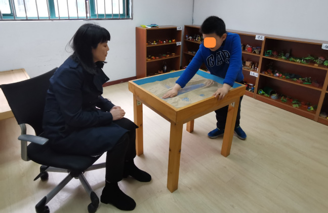 第二环节是为自闭症儿童开展心理康复活动。首先万谊老师为自闭症儿童进行了个体沙盘游戏的治疗,儿童在沙盘游戏过程中表达自己和缓解情绪,并与治疗师建立了互动和情感连接。接着开展了团体游戏治疗,包括舞动模仿、兴趣手工等,帮助自闭症儿童在团体游戏中获取到合作和互动的力量。