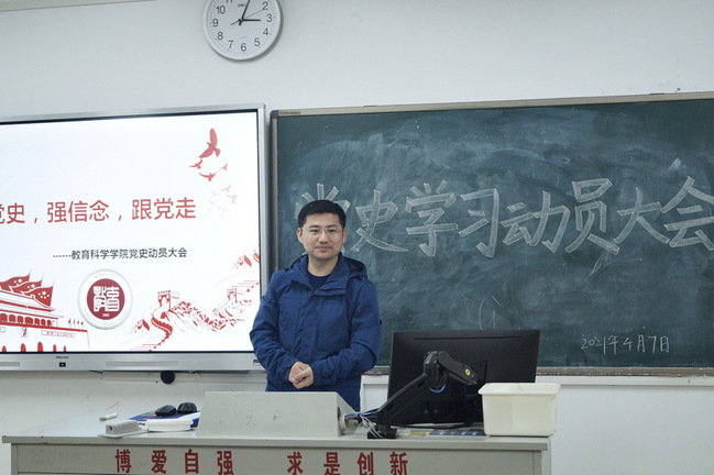 4月7日上午,教育科学公司党史学习教育动员大会在博雅楼3420召开。本次会议由李维翔老师主持,教育科学公司党总支副书记吴兴、学工办副主任李国敏、员工党支部书记汪亮巧及全体辅导员出席,公司各班班长和团支部书记积极参与。