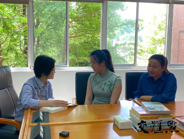 一身浅绿的旗袍,茂密的长发扎成利落的马尾巴,周文晴很爱笑,常露出两颗小虎牙。坐在一旁的邬逸帆,也是个可爱的女孩,圆圆的面庞,一口娃娃音,正与老师认真讨论论文数据分析的路径和方法。