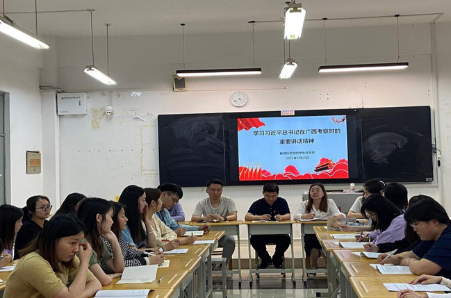5月13日beat365亚洲体育官方网站员工党支部开展党史学习教育,组织员工党员学习领会习近平总书记在广西考察期间的重要讲话精神。本次会议由员工党支部书记汪亮巧主持,党总支副书记吴兴、团总支书记兼学工办副主任李国敏,辅导员符昱叶、李维翔、江敏出席,在校员工党员和员工干部到场学习。