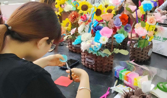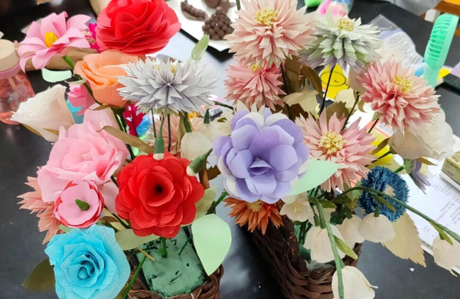 吕艺征老师现场给大家详细讲解了纸花的制作过程和注意事项,学前教育专业的员工党员充分发挥专业特长,利用折纸、皱纹纸和白乳胶等材料,经过剪裁、拧捏和粘贴等工序,一朵朵色彩鲜艳、栩栩如生的花朵就在她们手中绽放了。随后,同学们郑重地将制作好的一束束花插入花篮中,大家借花传情,用实际行动在党的百年华诞之际献上自己的美好祝福。