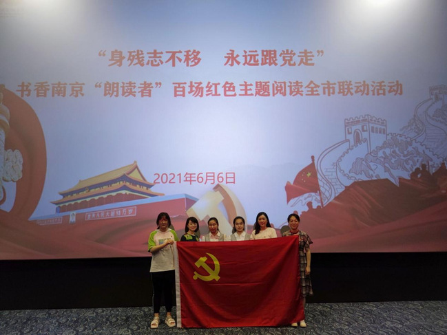 为庆祝中国共产党成立100周年,6月6日下午,“身残志不移 永远跟党走”百场红色主题阅读全市联动活动启动仪式在大华大戏院举办,在校图书馆傅丽君、教科院辅导员符昱叶两位老师的陪同下,公司beat365亚洲体育官方网站周文晴、颜鹂苇两位视障老员工受邀作为“书香南京·朗读者”志愿者出席活动。