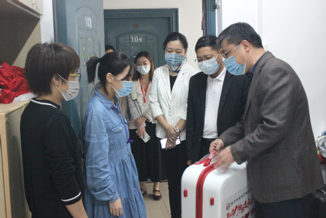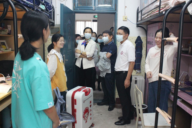 2021级新生报道工作正有序开展,新生们朝气蓬勃,洋溢着青春活力。公司秉承“博爱塑魂”的校训,为更好了解公司有需要员工的需求,帮助她们更快融入校园学习和生活,公司联系领导公司党委副书记王立新、教育科学公司党总支书记吴月华、经理刘新学及辅导员老师们于10月13日上午走访新生的宿舍并送出爱心大礼包。