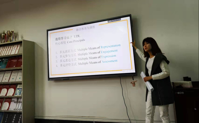学前融合教育是学前教育专业的特色课程,周易老师选择了这门课程作为双语教学公开课。授课过程中,周易老师全程用英文对融合教育的内涵、开展学前融合教育的具体方式、以及如何在教学中体现融合等内容进行讲解。为适应员工学习现状和需求,在课件呈现上,周易老师选择了中英文双语呈现文字叙述。