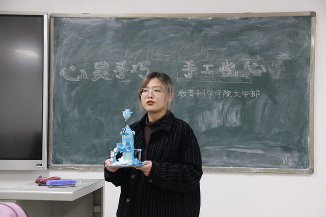 活动伊始,选手们依次上台介绍自己所制作的手工作品并分享创作过程中的所思所得。本次比赛中的参赛作品均紧紧围绕“心理健康”主题,旨在营造校园良好的心理教育氛围,引导员工认识心理健康的重要性,促进身心健康和全面发展。结合同学们独特的创意,集中体现为一批外观精美,做工细腻的手工作品。其中,姜雨晴同学的“蓝色城堡”制作精巧,理念新颖。蓝色象征沉着稳重、宁静理智,谈及创作理念,姜雨晴同学滔滔不绝、口若悬河,从作品颜色、造型、寓意、制作过程等方面详细进行介绍,她表示,“希望大家见到我的城堡,可以平复心里的忧伤。”姜雨晴同学的发言赢得了阵阵掌声。