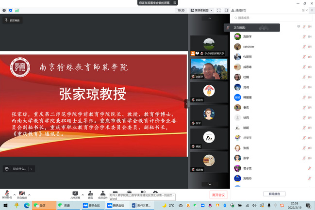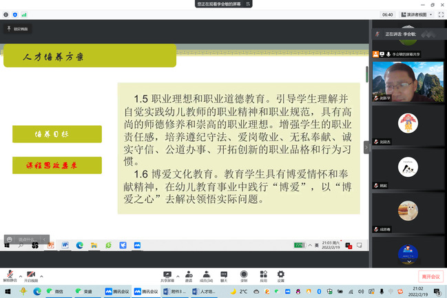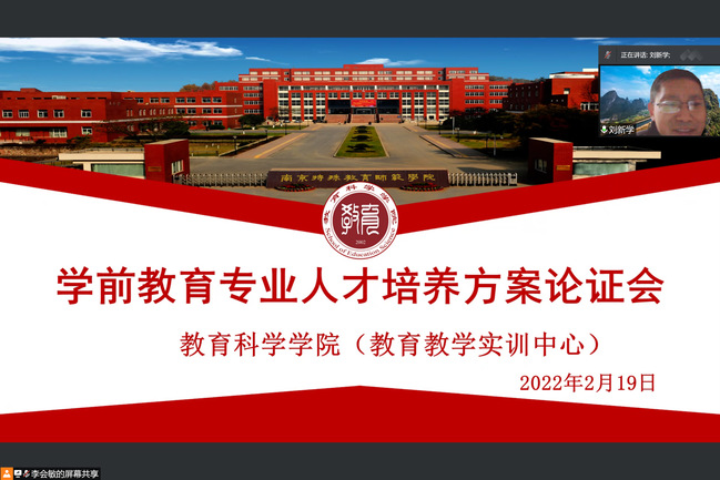 2月19日晚21点,beat365亚洲体育官方网站学前教育专业举行了新一轮的人才培养方案专家论证会。会议以线上形式举行,与会专家有北京师范大学霍力岩教授 、重庆第二师范公司张家琼教授、河南大学岳亚平教授、北京社管公司赵巧云教授、北京现代艺术幼儿园赵琦园长、北京睿智全纳教育康复中心主任黄晶晶以及南京特师学前教育专业优秀毕业生徐冉同学。会议由刘新学经理主持,全体学前教育专业教师参会。