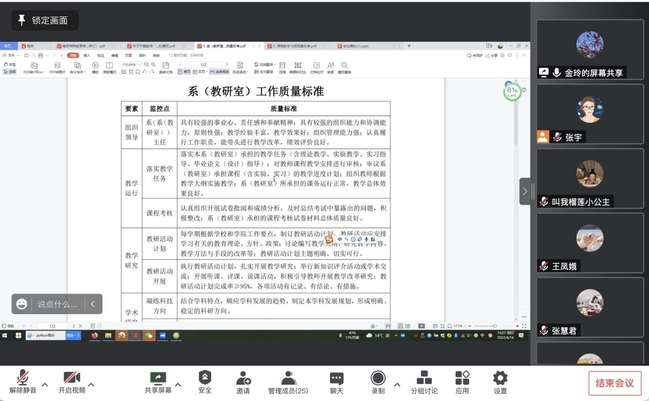 学前教育系的研讨活动由系主任金玲主持,学前教育系全体教师参加了此次会议。会议伊始,金玲主任首先带领大家共同学习了《人才培养方案质量标准》,并结合实际工作中需要注意的事项,对《系(教研室)工作质量标准》《实践课教学质量标准》《理实一体课教学质量标准》及《一流专业质量标准》等主要内容进行了详细的介绍;对教学环节中的课堂管理、教学材料准备、课程考核、大纲制定等进行解读。随后徐莉副经理与参会教师逐句进行对照讨论,帮助教师更好的了解教学的基本要求和注意事项。她特别强调,全体教师在工作中要明晰公司本科教学工作合格评估、师范类专业认证的要求及公司产品理念,结合实际工作,明确教学质量监控制度的执行细节和注意事项,依照各项规范开展公司产品工作,不断提高育人质量。