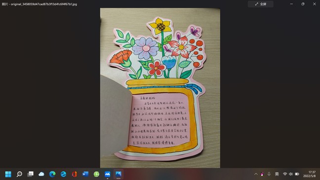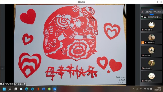 活动伊始,主持人用简洁明了的语言阐释母亲节的由来和意义,鼓励参与者们积极分享自己与母亲的美好回忆和感想。五月的第二个星期日是母亲节,天底下最伟大的是母爱,每个人的一路成长都离不开母亲的关怀和爱护,母亲给予我们的温暖恰似春日里一缕微风,又如秋日中一抹丰硕。参与者们紧紧围绕“母爱”主题,抓住那一缕微风,回忆缝隙里遗留的美好,或用相框定格岁月匆匆带来的奇妙联系,寻找母亲的青春年华;或用笔墨挥洒难言的情绪,献给母亲无言的祝福;或用红色彩纸刻出溶于心头的回忆,表达对母亲深沉的思念。同学们在参与本次活动过程中回首往事,将对母亲的祝福与思念倾注于作品中,充分体现母爱的伟大,也让聆听者感受到母爱的伟大。