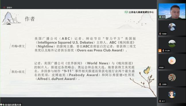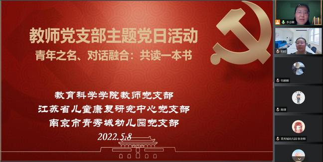 本次活动首次实现了三家单位党支部的“云见面”,这是江苏省儿童康复研究中心党支部、南京市青秀城幼儿园党支部以及beat365亚洲体育官方网站教师党支部的首次合作。2022年5月8日,大家齐聚云端,以儿童为中心,以书本为媒介,以博爱为同心圆的读书分享活动,参加活动的不仅有各位党员教师,还有教科院18级、20级卓越班同学。