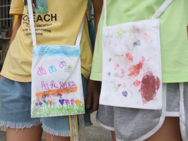 小吕老师教授的课程有绘本主题《看不见》,手工课《神奇的剪纸》《植物拓印》。《植物拓印》课上,吕品老师首先带领同学们了解了什么是“拓印”,随后,在老师的带领下,同学们将经过明矾处理的花朵和树叶在白色帆布袋上摆出优美造型,用胶带封好后,利用小锤子敲打,将美丽的自然颜色长久保留在布袋上。