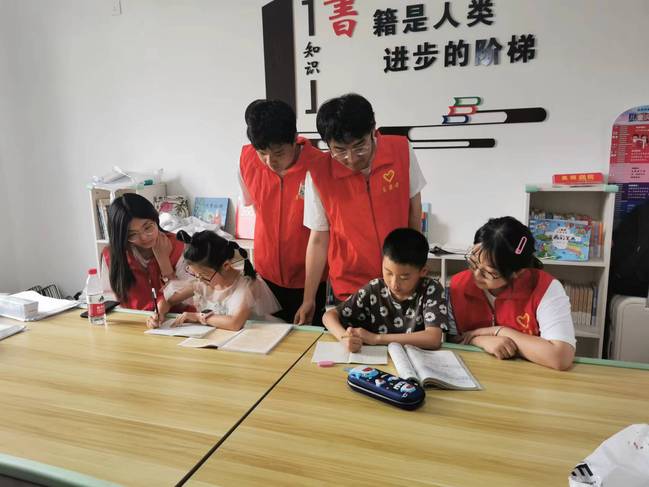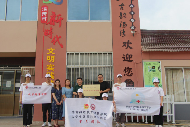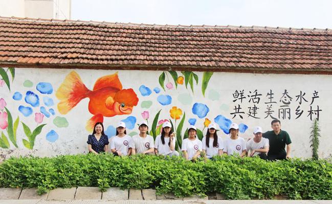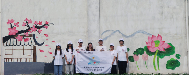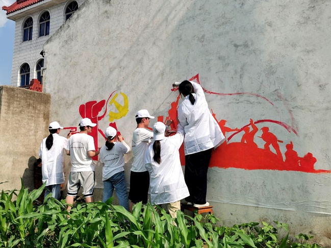 七月酷暑,天气时而骄阳似火,时而大雨倾盆。在高大的墙面下,队员们细心描绘着党旗的图案,勾勒着大写的中国梦;他们一笔一画下,栩栩如生的金鱼跃然墙上;他们谈笑风生中,诗情画意小桥流水跳入眼帘。白天团队成员在外进行手绘;中午休息时,队员为村里的小员工们开展读书与作业辅导活动,在这个临时的“儿童之家”,他们为孩子们讲解生动有趣的故事,普及科学知识,耐心回答着每个孩子的疑问,将学前教育专业特色和志愿活动深度融合,在实践中增强了专业技能;傍晚,实践团成员们和村民们在文化广场纳凉、一起载歌载舞,他们和村民一起畅谈墙绘对乡村的美化作用,村民教团员们学习当地方言,一片欢乐和谐的场面。经过团队的共同努力,四幅作品跃然于墙面。墙绘实践美化了乡村整体环境,同时也展现了南京特师学子的社会责任感和时代担当。