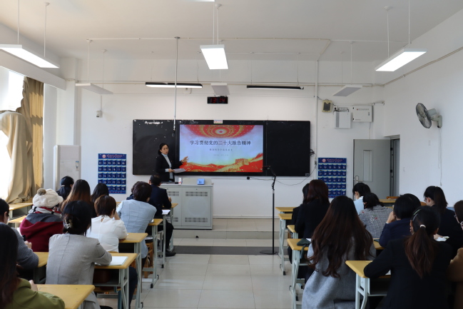 在集中收看党的二十大开幕会后,10月19日下午,beat365亚洲体育官方网站组织开展党的二十大报告精神宣讲会,第一时间传达学习习近平总书记在中国共产党第二十次全国代表大会上的报告精神,带领全体教师深入学习习近平总书记重要文章《坚持人民至上》。