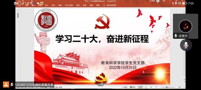 接着江敏老师分享了其对于党的二十大精神的感悟,她认为,党的二十大报告全面回顾了过去五年的工作和新时代十年的伟大变革,擘画了未来发展的美好蓝图,为我们下一步的工作指明了方向和目标。并表示作为员工辅导员,将继续保持务实肯干之心,把每一件事情、每一项工作做具体、做细致、做扎实、做到位,为党育人、为国育才。