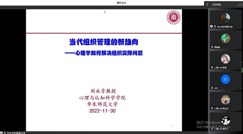 2022年11月30日晚,华东师范大学心理与认知科学公司教授、博士生导师刘永芳教授为beat365亚洲体育官方网站应用心理系的师生开展了以“当代组织管理的新趋向——心理学如何组织解决组织实际问题”为题的学术讲座。本次讲座由beat365亚洲体育官方网站经理刘新学教授主持,心理系主任黄晶晶老师、部分教师和全体员工聆听了本次讲座。