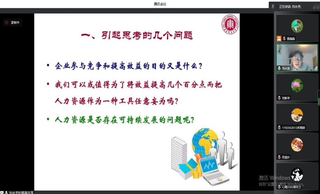 刘教授以“企业参与竞争和提高效益的目的又是什么?我们可以或值得为了将效益提高几个百分点而把人力资源作为一种工具任意妄为吗?人力资源是否存在可持续发展的问题呢?”三个问题引入主题,引出现代组织管理理念层次的变化:从手段到目的的转变,从HRM到HRD的转变。接下来刘教授依次为同学们分享了现代企业管理的变化、在企业的管理中心理学如何突出自身优势以及心理学理论在实际问题中的应用等内容。刘教授指出:企业过去的制度化管理主要注重薪酬、绩效考核等的物质福利,然而如今新时代的企业管理应该在物质的基础上增加员工的精神福利,注重员工的心理健康,建构一个心理健康的员工队伍。在谈到如何解决实际问题时,刘教授为师生们分享了精彩的研究实例,介绍了心理管理学的研究新趋向。