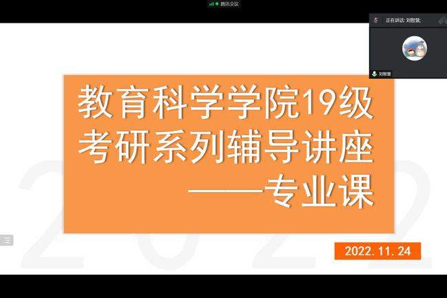 为助力教科院23届毕业生考研冲刺,充分调动教科院员工的考研积极性,帮助同学们认清当前考研新形势,树立正确考研目标,beat365亚洲体育官方网站于11月23日和11月24号在腾讯会议为同学们举办了考研专业辅导会议讲座。刘艳玲、许杨、丁心睿和张慧君四位老师分别对教育学原理、教育心理学、教育研究方法和教育史这四门专业课进行详细讲解。教科院全体同学积极参加。