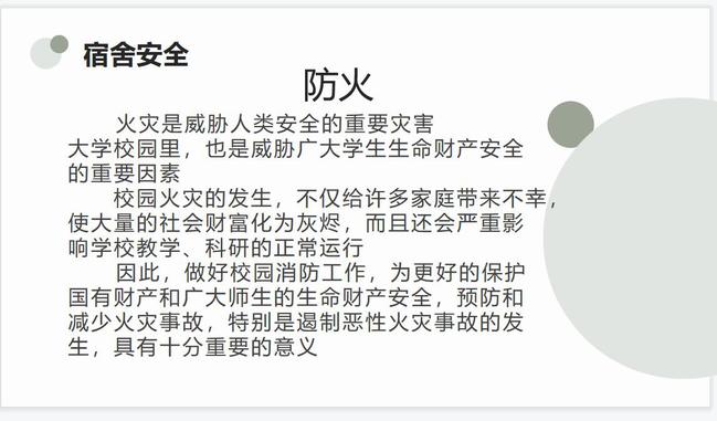 会议开始,主持人简要地介绍了关于宿舍卫生与安全教育方面的知识。随后,他通过一些短片向同学们讲述了宿舍里会存在的一些安全隐患和安全常识,并认识到在宿舍日常生活中防患于未然的重要性。最后,他与同学们展开了互动环节,给同学们提出一些宿舍安全隐患,让同学们通过自我思考并结合自己的经验,谈谈这些隐患给我们带来的不利之处,以及需要采取的措施,从而提高同学们防范意识。同时,他也提醒同学们重视宿舍的卫生问题,保持良好的宿舍环境,鼓励同学们从自己做起,从小事做起。
