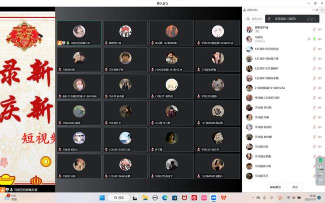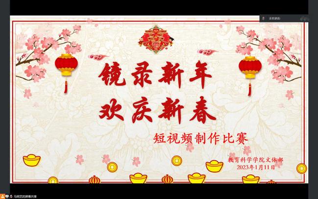 前期经过参赛同学的精心准备,短视频最大程度地展现了不同地区的新年习俗,视频内容丰富多彩,大草原上一排排蒙古包、屋檐上挂着的红灯笼等都让人印象深刻;贴春联、包饺子、写“福”字等传统习俗,无一不表现出同学们对新年的期盼;一桌桌热腾腾的饭菜表现出与家人团圆的喜悦......有的同学已提前放起了美丽的烟花,一场场璀璨夺目的烟花背后,是对新年的祝福与对未来学习生活的期盼。精选的背景音乐与镜头转场特效也让视频的表现效果大幅提高,有的同学还配以感情充沛的朗诵表达内心新的一年来临的喜悦。在视频作品展示的最后,主持人进行总结并提前表达了对同学们的新春祝福。