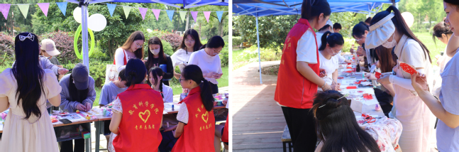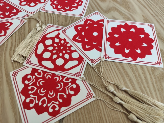 开幕式结束后同学们踊跃参与非遗文化游园会活动,本次游园会主要分为六部分。在“你画我猜”环节中同学们根据题目进行绘画,猜想非遗相关的词语,同学们从中了解到非常丰富的非遗文化知识。在“剪有其理”环节中,同学们根据非遗文化题目,将图案从纸上剪下,一个个生动形象的图案跃然纸上。在“剪艺多彩”环节中,同学们用红纸剪出“三折四角团花”“四折五角团花”等,并制作成书签,样式精美、独具匠心。同学们在小游戏中了解非遗文化知识,相互交流剪纸等手工技巧,感受手工的乐趣。
