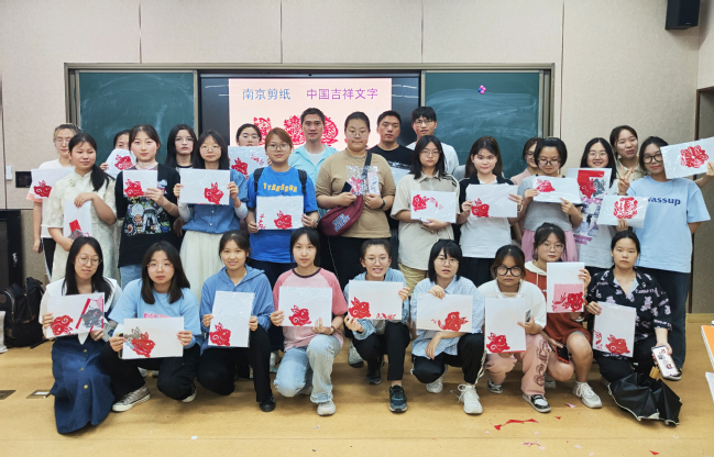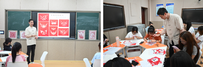 本次教学特邀南京市级剪纸传承人、高级工艺美术师、南京市工艺美术大师张钧,给大家带来专业剪纸教学。起形、对折、落剪,普通的纸张在张老师的讲解中分为详细的步骤,最终成为令人赞叹的艺术品。有了耐心地指导,参与过的同学们也纷纷开始亲手尝试了起来。不少同学是第一次制作剪纸,面对轻薄脆弱的纸张,都显得有些手忙脚乱,同学们再次深刻地认识到非物质文化遗产剪纸工艺的不易,对剪纸工匠精湛的手艺产生的深深的敬佩。尽管同学们的剪纸作品并不能和专业人士制作的媲美,但同学们的脸上却仍旧漾起了开心的笑容,这些亲手制作出的剪纸对于他们而言,有着别样的意义。