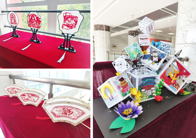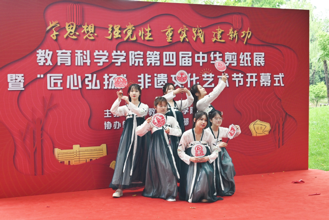 公司党委副书记、董事长王立新宣布“匠心弘扬,纸上跃然”非遗文化艺术节开幕式正式开始。持伞慢行游山清水碧,再乘舟对酌归故里。开场舞表演同学伴随优美的歌曲起舞,预祝本次剪纸展圆满成功。缅怀英雄烈士,传承红色基因。诗歌朗诵《英雄祭》,台上同学们精神饱满,仪态端庄,她们的朗读慷慨激昂、豪迈奔放,亦或柔和婉转、沉稳抒情,表达了对英雄烈士的缅怀和崇敬。青年强则国家强,青年兴则国家兴。剪纸作品走秀《华裳九州》,作品题材包括向雷锋同志学习、助力新农村建设等,同学们将作品与团扇、古典灯具结合,伴随着舒缓的乐曲,为大家展现了非遗文化的古韵。