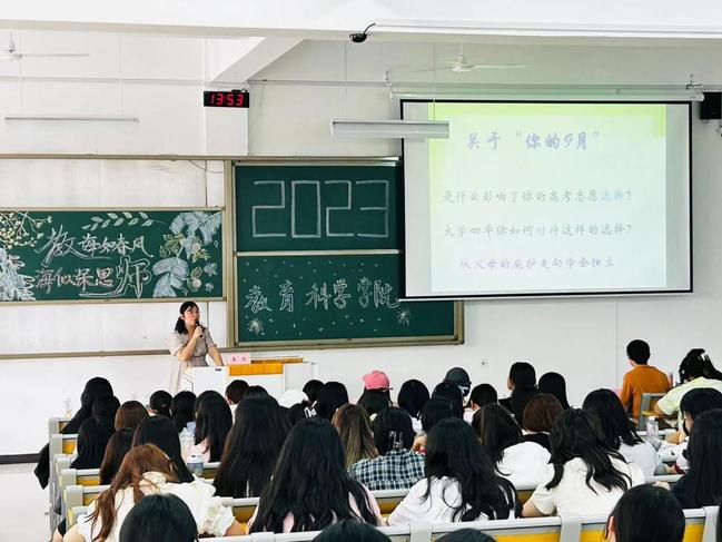秦奕老师为学前教育专业的同学进行专业导航教育,她从高考志愿的选择引入到大学四年,大家已经进入新的阶段,需要不断进行调整,引出在新阶段需要"教育情怀、专业、脚踏实地"。并通过视频、PPT的形式为大家讲解专业学习需要兴趣,积累,坚持。分享了张慧君、周易、金玲等老师的真实经历,一句“幸福来自于孩子们的进步,他们的纯真治愈了我们。”激发了大家选择学前的坚定之心,也更深理解了那句眼里有孩子,心怀希望。秦奕老师借尖毛草的故事,表达对大家厚积而薄发的祝愿!窗外午后阳光正好,窗内春草向阳。