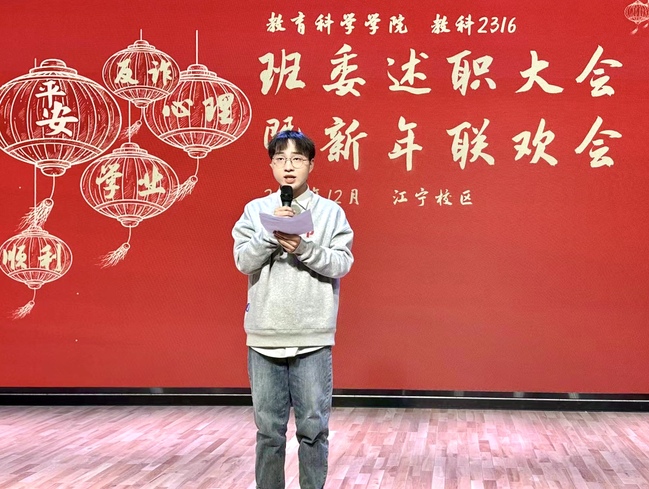 近日,beat365亚洲体育官方网站教科2316 班在江宁校区B101室举办班委述职大会暨新年联欢会。此次活动旨在加强班级内部沟通,提升班委团队的管理能力,同时为大家提供一个欢乐的交流平台。辅导员兼班主任陈宇老师参与本次活动。
