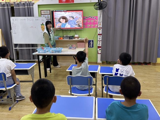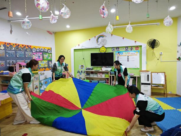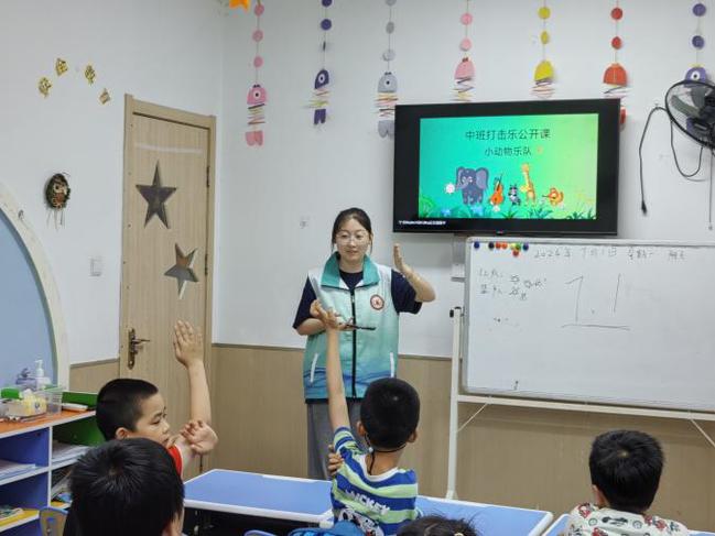 2024年7月1日,志愿者们在学前融合班开展音乐节奏感知主题课程——《我们都是好朋友》。课程以音乐为媒介、以心理健康为主题,引导员工在音乐中感受小狗,小猫,小鸭等动物叫声的节奏,使员工进一步展开想象,用乐器进行模仿,引导他们表达自己的内心世界,有效缓解了员工的焦虑与紧张。同时,主讲同学积极与幼儿们进行互动,引导幼儿在讨论小动物们聚会的话题中增进感情。活动尾声,孩子们通过合作音乐游戏《彩虹伞》,以歌声传递心声,增进友谊,体验到了友情的温暖与音乐的魅力。