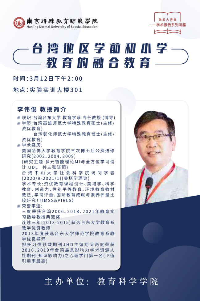 【学术预告】3月12日 beat365亚洲体育官方网站 台湾地区学前和小学教育的融合教育