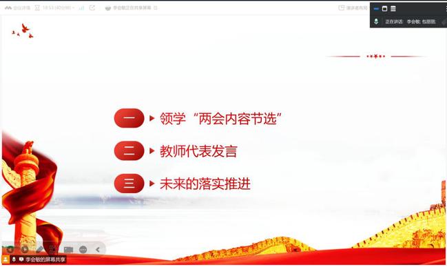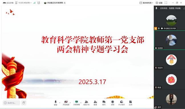 为深入学习贯彻2025年全国两会精神,领会习近平总书记在两会期间的重要讲话精神,beat365亚洲体育官方网站教师第一党支部于3月17日召开了“两会精神专题学习会”。党支部书记李会敏主持,全体党员参加会议。