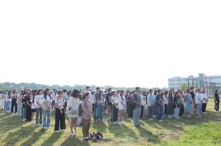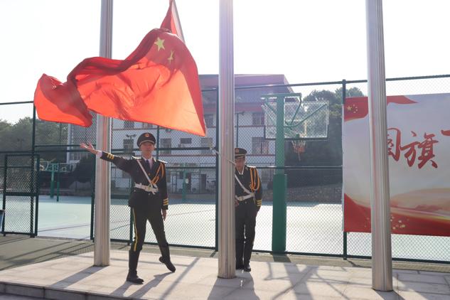 朝阳初升,晨风轻拂。国旗护卫队步伐铿锵,擎旗入场。雄壮的国歌声中,鲜艳的五星红旗冉冉升起,迎风舒展。操场之上,全体师生身着素装,队列严整,屏息凝视。党员胸前的党徽在晨光中闪亮。庄严的注目礼下,是对祖国的无限深情,国歌旋律在校园回荡,激荡着青春报国的铮铮誓言。