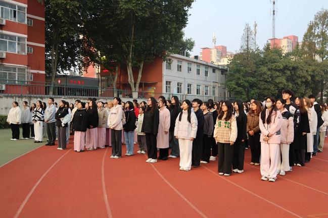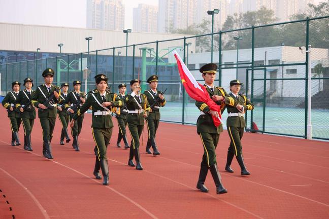 晨光熹微,洒满校园。国旗护卫队队员迈着铿锵有力的步伐,整齐行进至旗杆基座。在雄壮的国歌声中,鲜艳的五星红旗冉冉升起,划破天际。全体师生肃然而立,齐声高唱国歌,目光追随国旗徐徐上升,神情庄重,眼中饱含对祖国的赤诚与敬意。